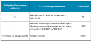Le tarif de cette nouvelle taxe varie selon la catégorie d’émissions de polluants à laquelle appartient le véhicule : (Mention case V.9 sur la carte grise)